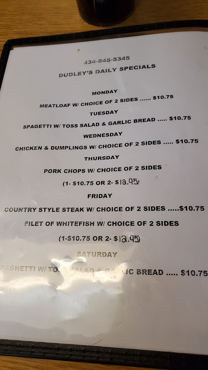 At Dudley's Family Style Restaurant Menu, you'll find a warm and welcoming atmosphere perfect for enjoying home-cooked meals with the whole family. The menu offers a variety of classic comfort foods, with generous portions and a variety of options to satisfy every craving. Whether you're in the mood for crispy fried chicken, tender pot roast, or savory meatloaf, there's something for everyone. The sides are just as comforting, featuring mashed potatoes, green beans, and freshly baked cornbread that complement each meal perfectly.